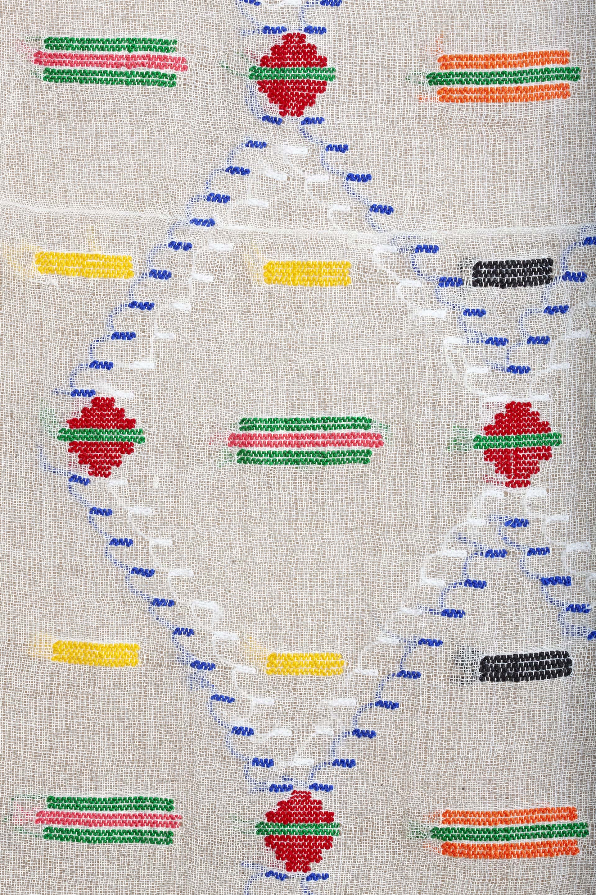 Boyabat Kerchief is a 50-60cm wide-long local weave which has plain weaving weft, shaped with three rows of red pattern scarves in crosses/plaids on all four sides, woven with coloured pattern scarves on a white background. In the very old examples, the warp and weft were linen, the pattern wefts were cotton, while cotton material was generally used in the warp, weft and pattern threads. The colouring pattern of the kerchief is usually as follows: white colour (natural cotton colour) on the ground of the weaving, red and white on the edge lines, and red, dark red, green, blue, yellow, orange, turquoise, pink and magenta in the pattern yarns. Patterns are created by additional weft threads of different colours and thicknesses. The four sides of the circle are striped and the corners are crossed/plaid. The Boyabat Kerchief is not famous for its design name, but for the pattern used on it. (In local names) Zincir, Sinek, Süydürme, Enikızı, Aybütünü, Mühür, Dört Müdür, Ersünlü, Koyun Gözü, Kaymalı, Gürel, Sandık, Put, Dört put bir arada, Heybe, Demirkırat are the mostly seen patterns. Headscarves and veils are made from the Boyabat Kerchief.
